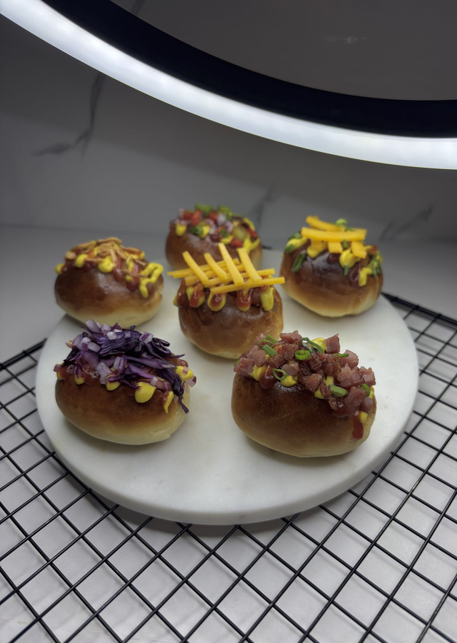 Mini saucisse - sauce ketchup/moutarde - oignon crispy - cheddar - cornichon
